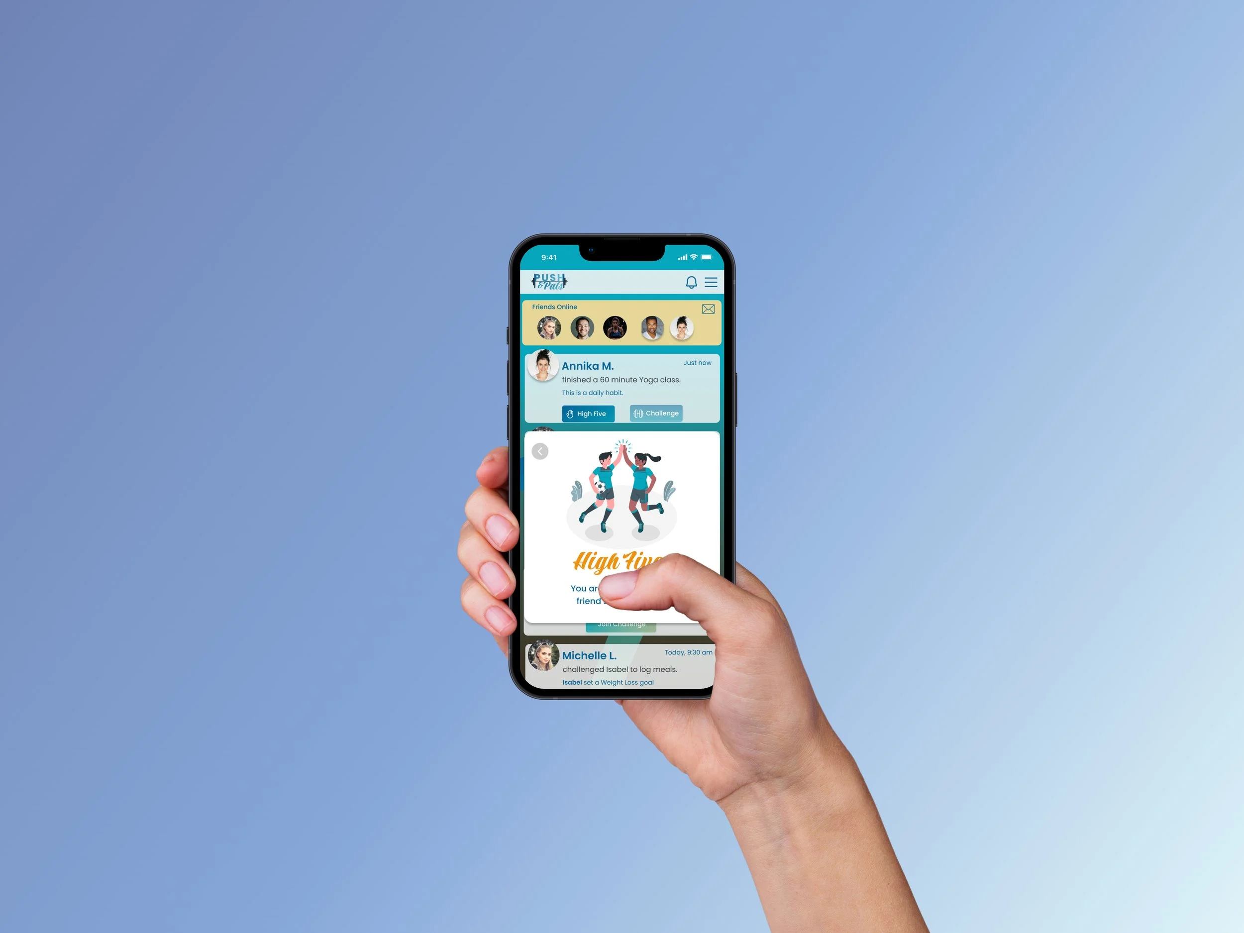The solution I designed for this problem was to create a “quick message” pop up screen that was easily accessible for a short exchange between friends. To increase repeat usage and engagement, the app allowed users to challenge each other based on the goals that another user set for themselves. Users were also able to “high five” for wins or “challenge” for an encouraging nudge.